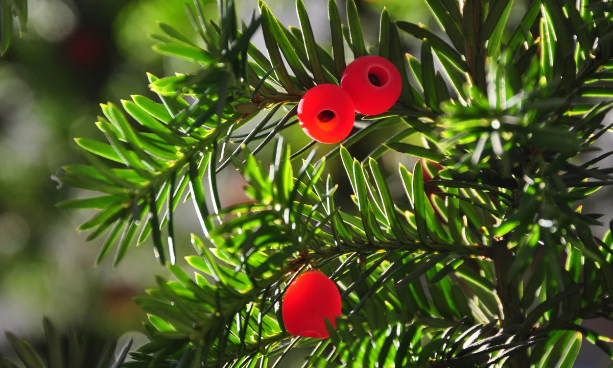 Een venijnboom is een groenblijvende traaggroeiende conifeer met giftige naalden en felrode bessen.